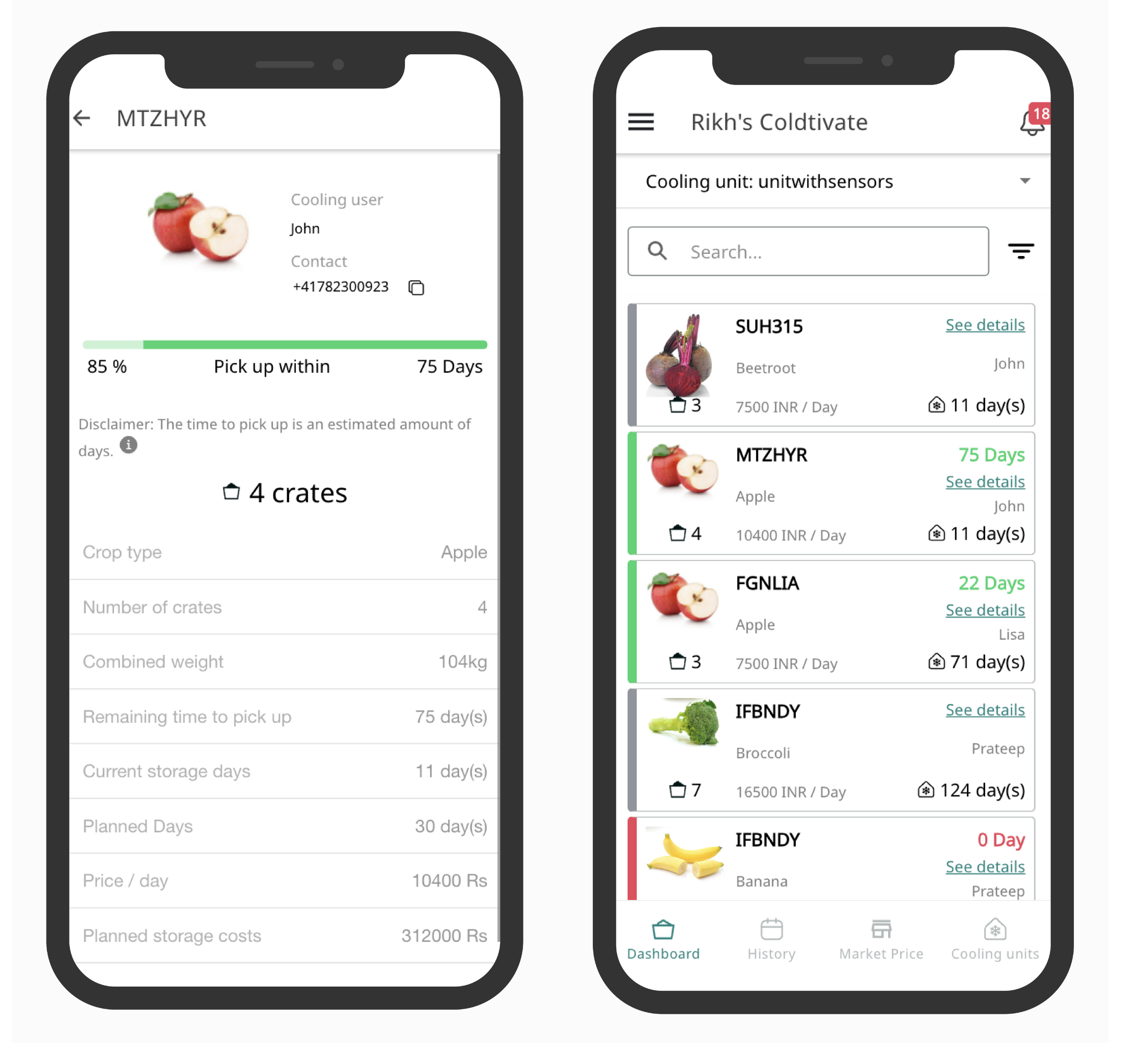 Every six hours, the values shown on the Coldtivate app are recalculated with updated forecasts based on the latest cold room temperature data (Figure 4). Farmers can directly check the remaining shelf life of their crates in the mobile app. If they do not have a smartphone, "warehouse operators can notify them of how long their produce will remain fresh in the cold room," said Gajardo. Ultimately, this information will help farmers avoid distress selling and unnecessary disposal of unsold produce.