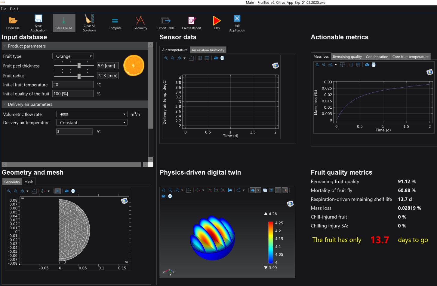 "Let's say a new shipment arrives at a cold room," Gajardo proposed. "The operator opens the Coldtivate app on their phone and enters the type of produce, current temperature, days since harvest, and other relevant values. The mobile app then generates a text file containing this information. The values in this text file serve as input arguments for the COMSOL app, which then calculates the expected shelf life. This calculation is then written into an output file, and the remaining quality and number of days are subsequently displayed in the mobile app’s user interface."